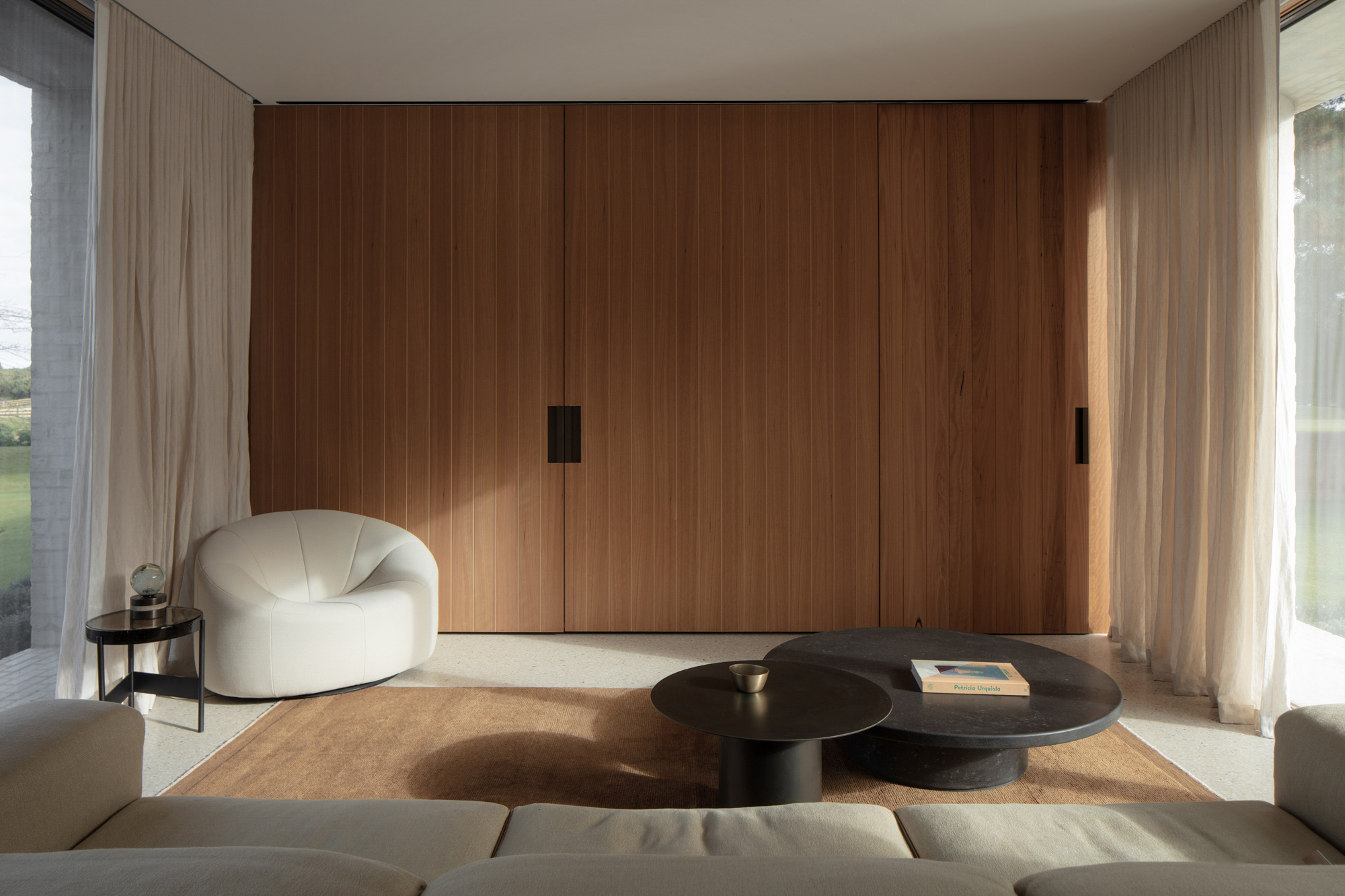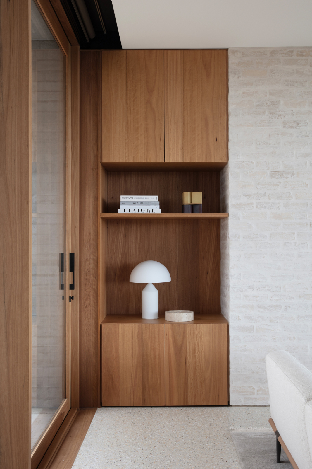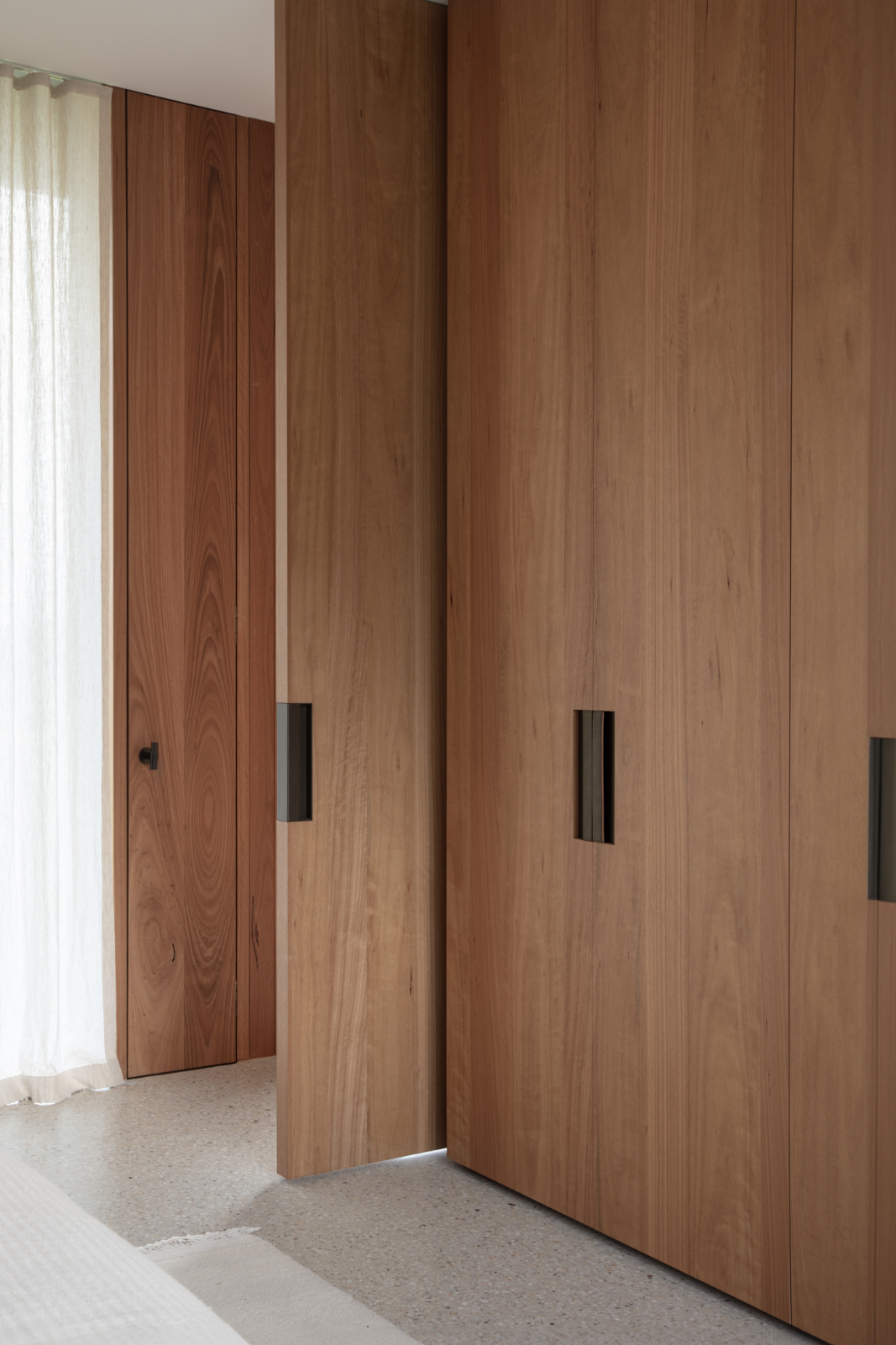 Boneo Road House is a refined coastal retreat where architectural joinery plays a central role in shaping calm, grounded family living. Throughout the home, carefully crafted elements – Blackbutt veneer joinery, natural stone benchtops with integrated basins, and solid timber features – reflect a commitment to tactile, enduring materials. Custom brass handles with leather inlays add warmth and detail. Integrated Sub-Zero appliances and automated features bring modern convenience. From seamless internal doors that blend with the joinery to the stainless steel BBQ and alfresco cabinetry, every element has been designed with clarity and precision, creating a cohesive and tranquil living environment.
