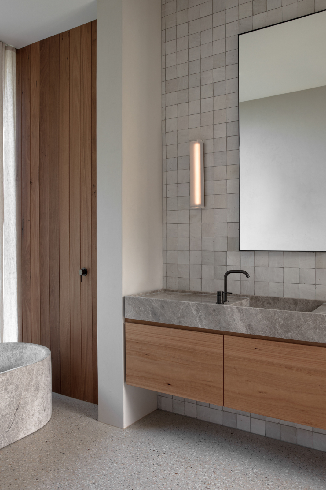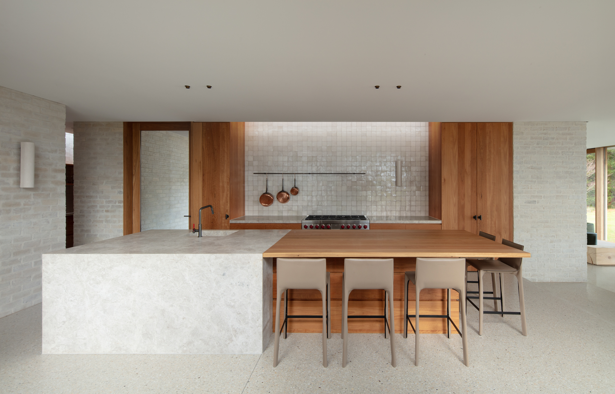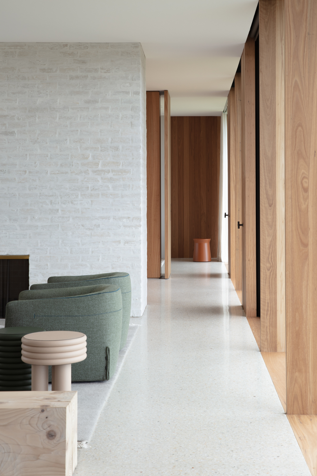 Boneo Road House is a refined coastal retreat where architectural joinery plays a central role in shaping calm, grounded family living. Throughout the home, carefully crafted elements – Blackbutt veneer joinery, natural stone benchtops with integrated basins, and solid timber features – reflect a commitment to tactile, enduring materials. Custom brass handles with leather inlays add warmth and detail. Integrated Sub-Zero appliances and automated features bring modern convenience. From seamless internal doors that blend with the joinery to the stainless steel BBQ and alfresco cabinetry, every element has been designed with clarity and precision, creating a cohesive and tranquil living environment.
