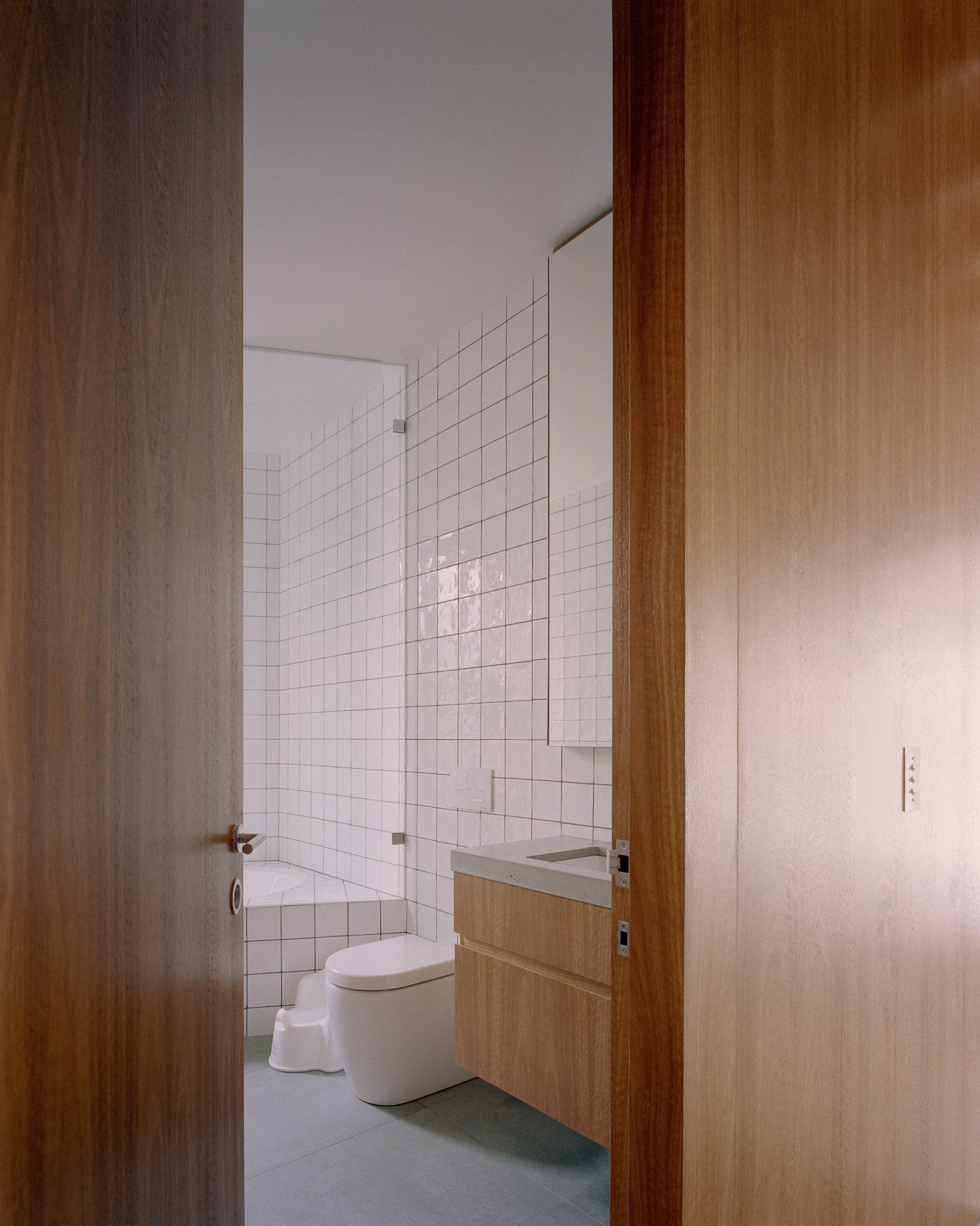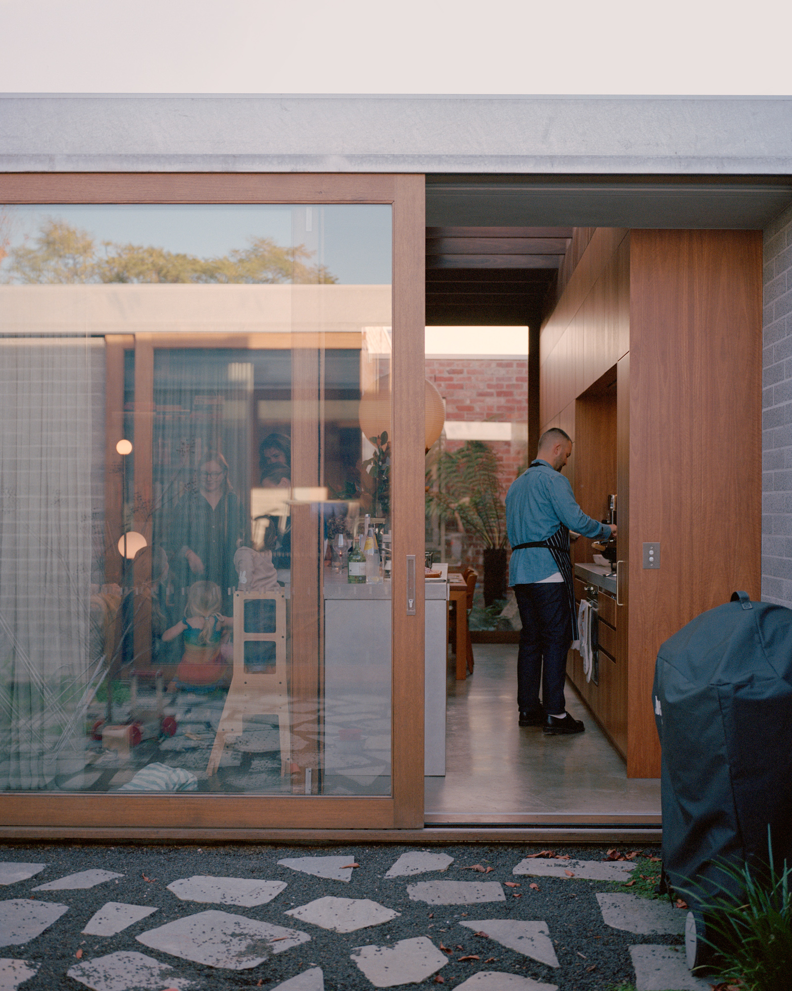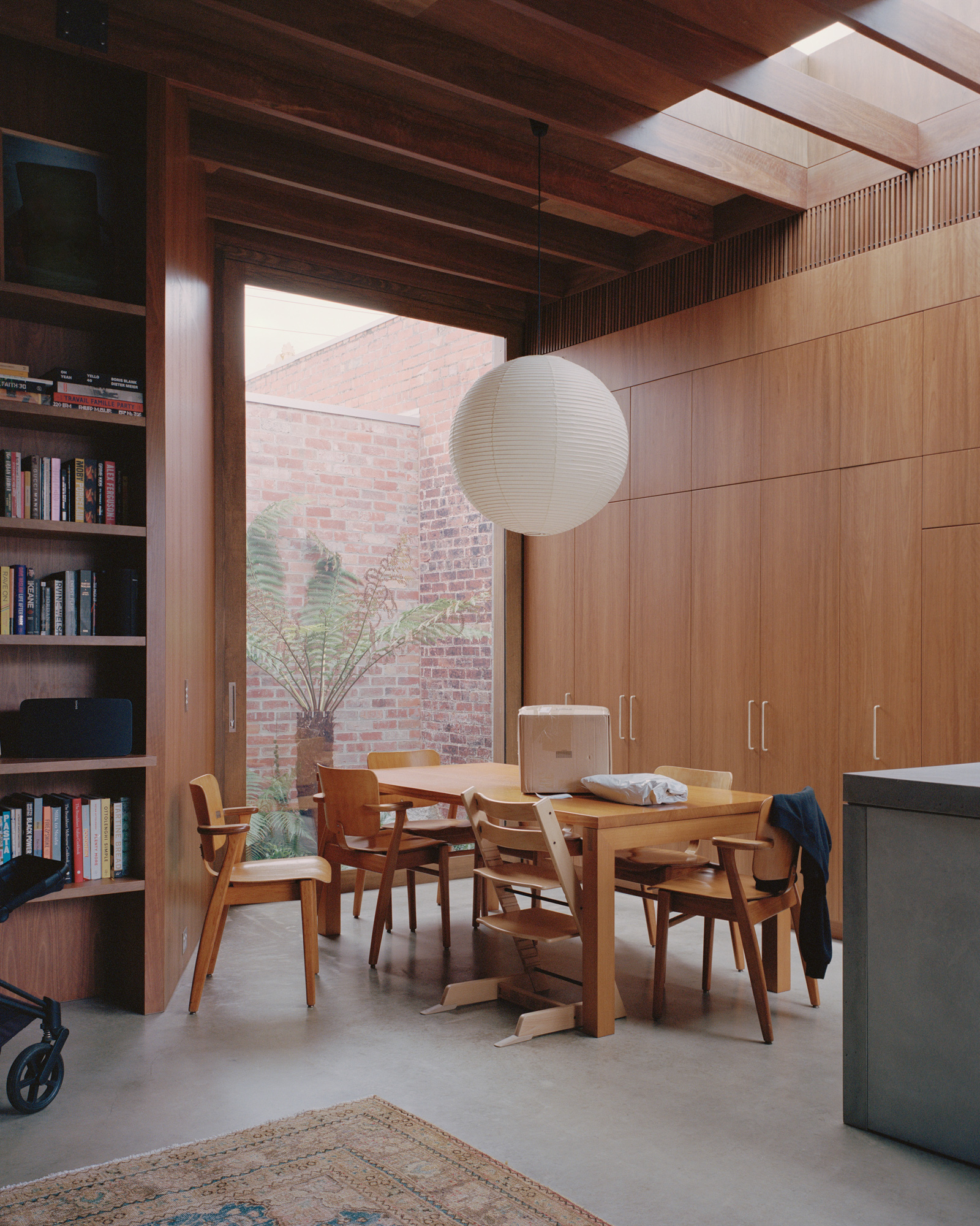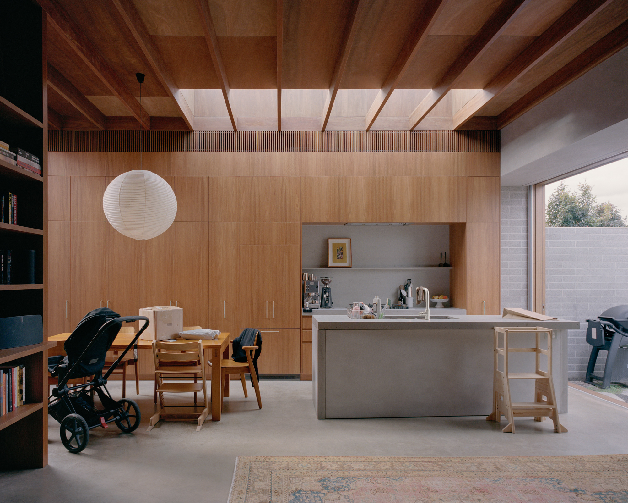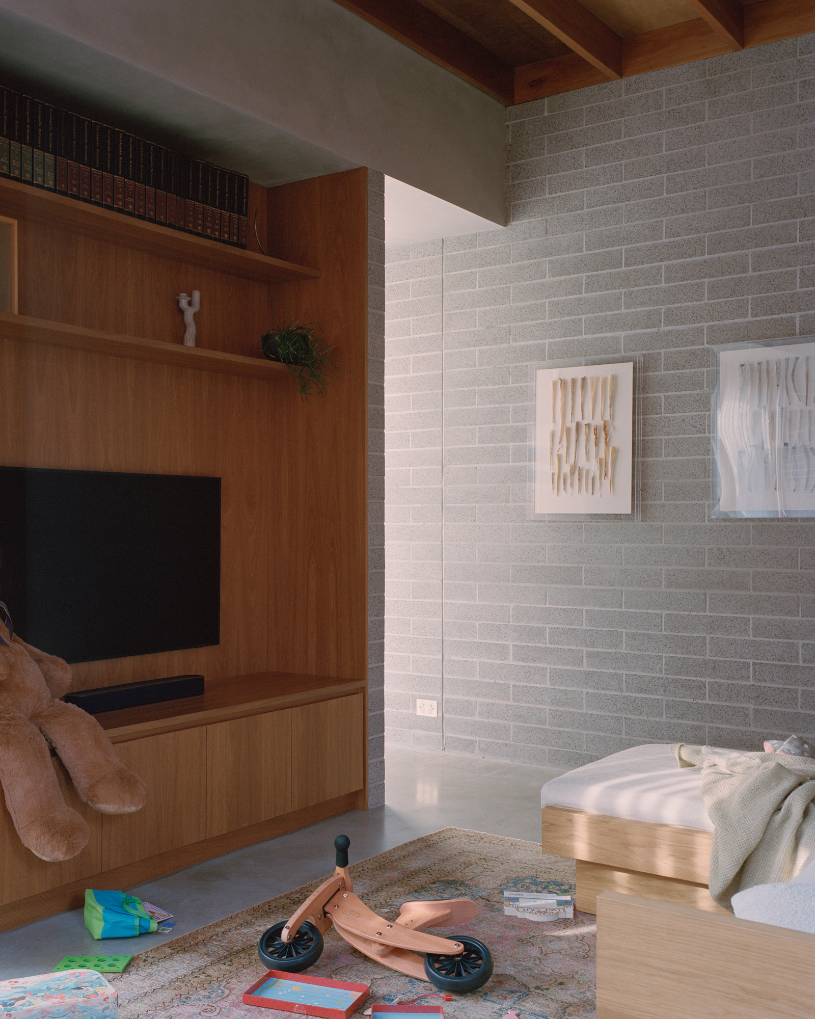 This renovation respects the character of the original worker’s cottage while introducing modern elements that support contemporary living. The design embraces simple forms and a warm, natural material palette to create functional, cohesive spaces. A wall of Spotted Gum veneer joinery provides extensive storage across the living area and multipurpose studio, with integrated appliances and a concealed pantry allowing the kitchen to retreat into the background. Concrete benchtops add a subtle contrast, while a custom bulkhead with timber A/C grill connects seamlessly with exposed ceiling beams. A full-height Spotted Gum bookshelf continues into matching wall paneling, reinforcing the home’s calm, unified feel.
