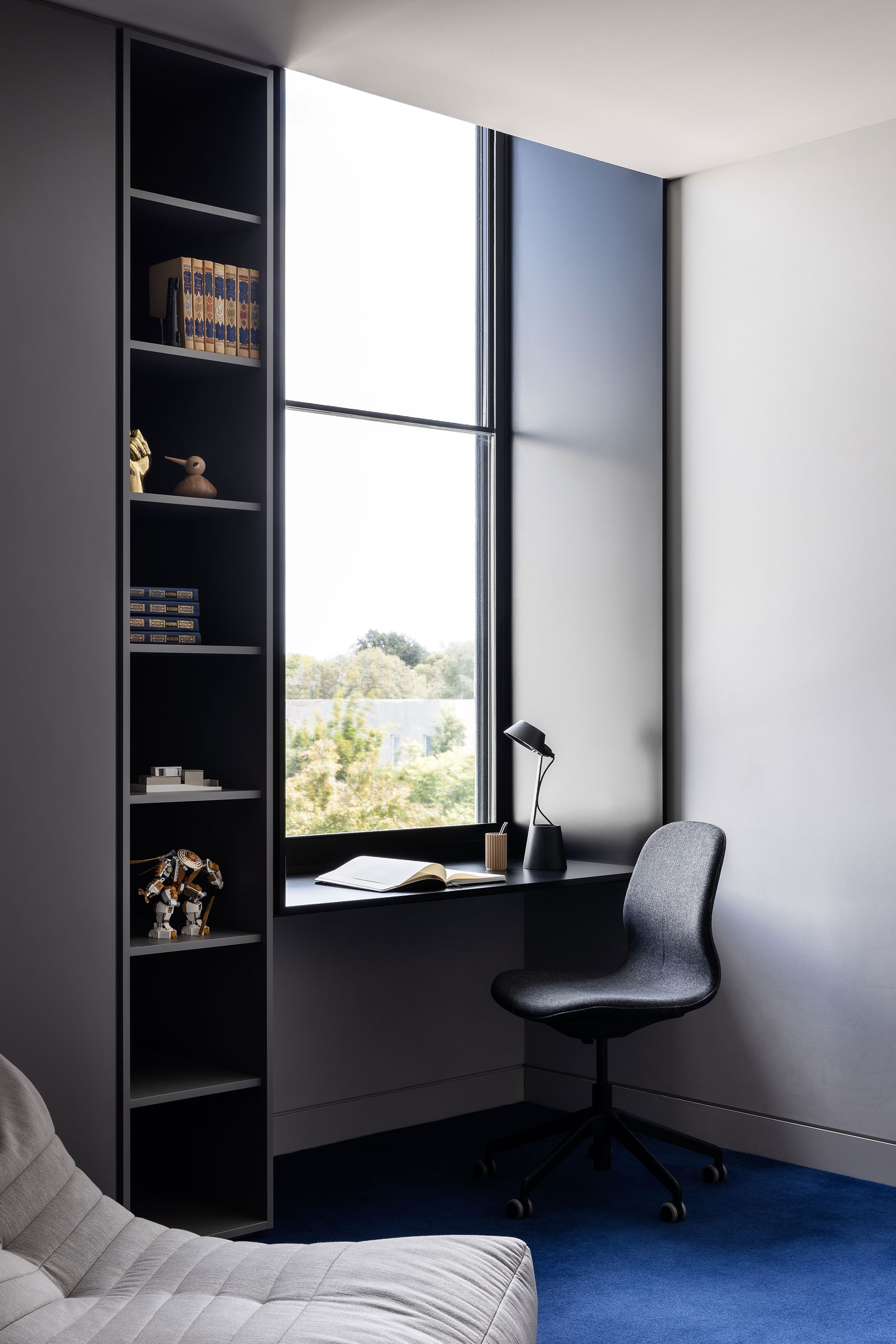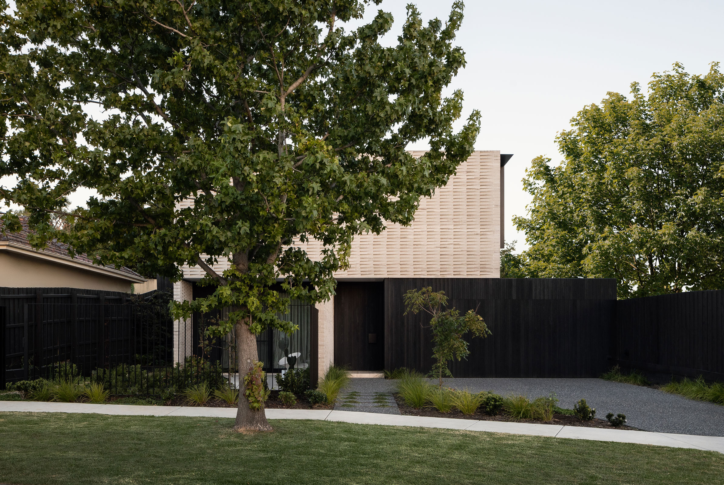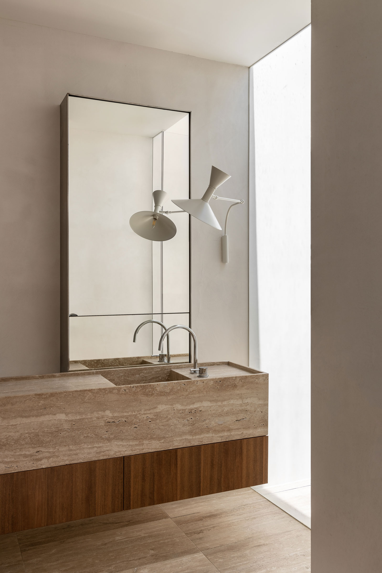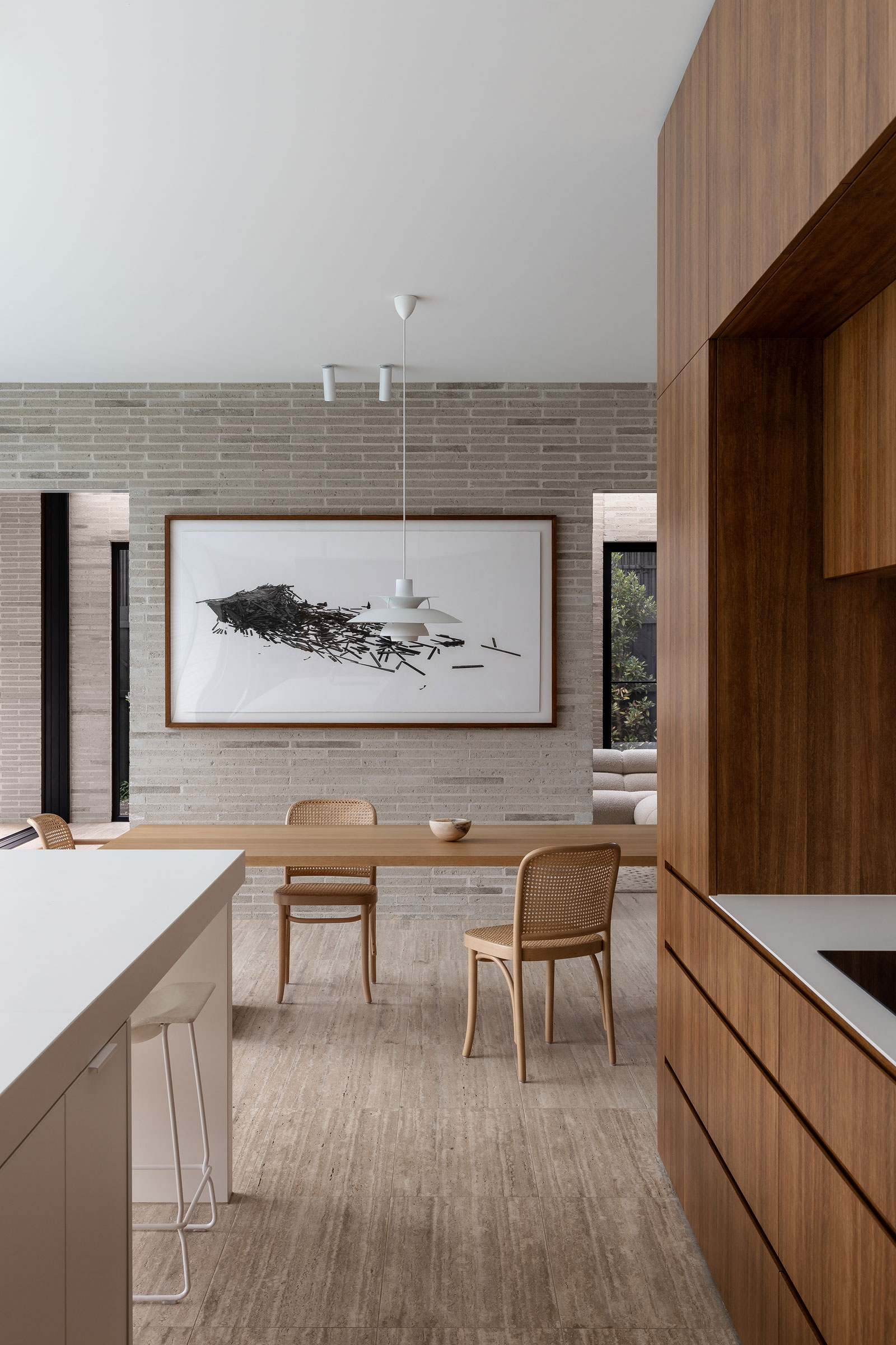 The new home is a sanctuary where natural materials and concealed functionality define each space. In the open-plan kitchen, Spotted Gum veneer joinery wraps a central pod that flows seamlessly into the pantry and includes a concealed bar and drinks station. Integrated appliances and a custom timber-clad door into the laundry maintain the clean, minimal aesthetic. In the ensuite, a bespoke travertine benchtop with integrated basins is paired with a custom mirror cabinet framed in brushed stainless steel. The study features a 4.5-metre solid timber desk and built-in shelving, while the master robe is finished in smooth 2-pack paint.