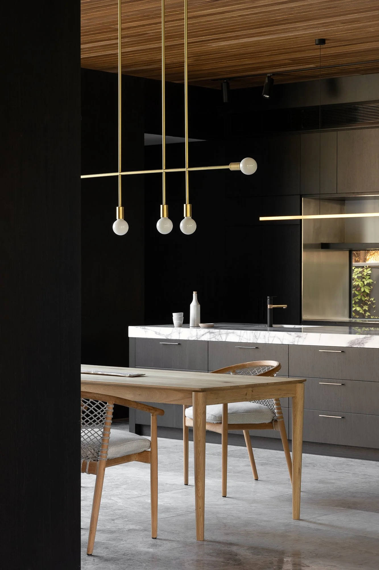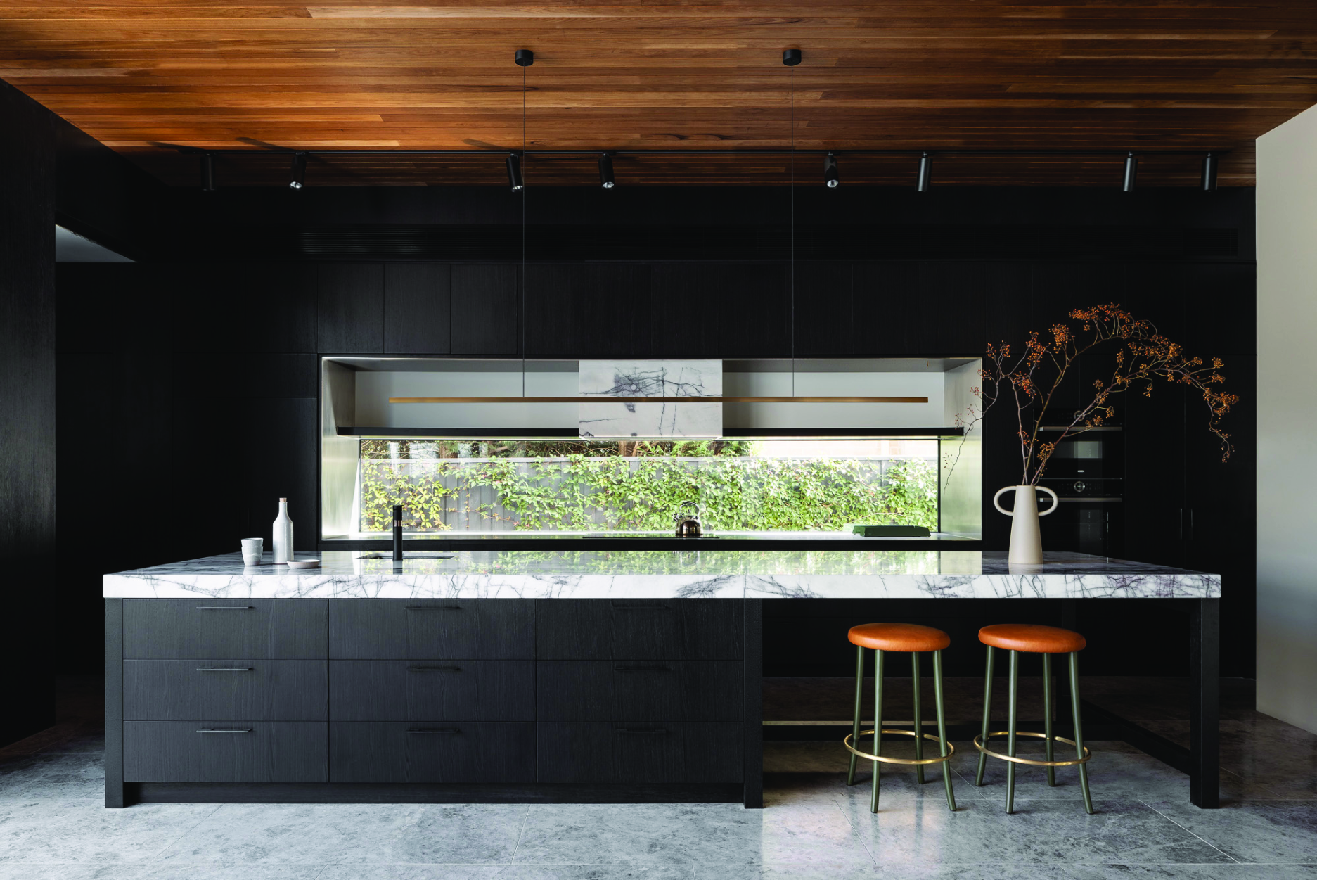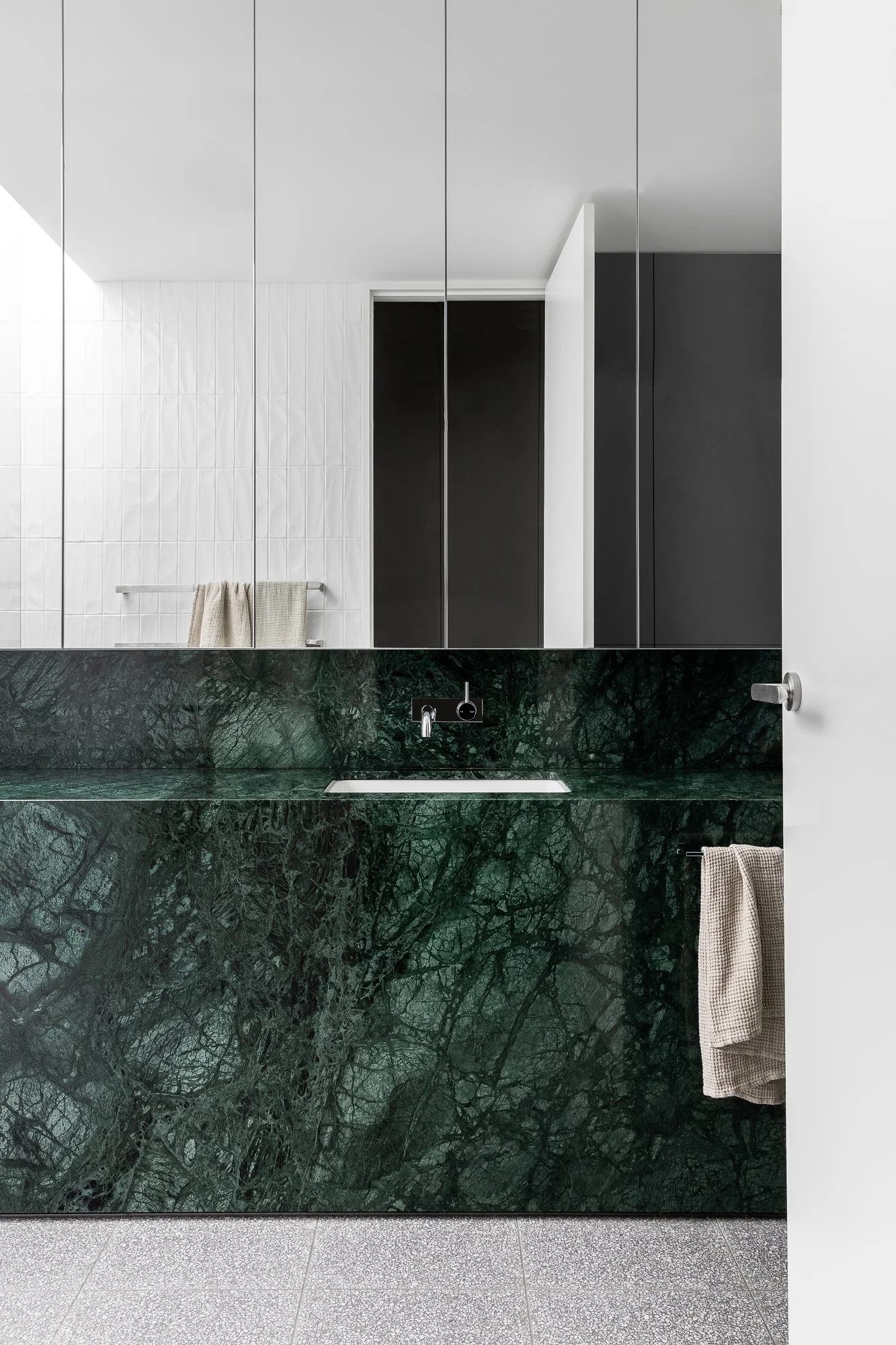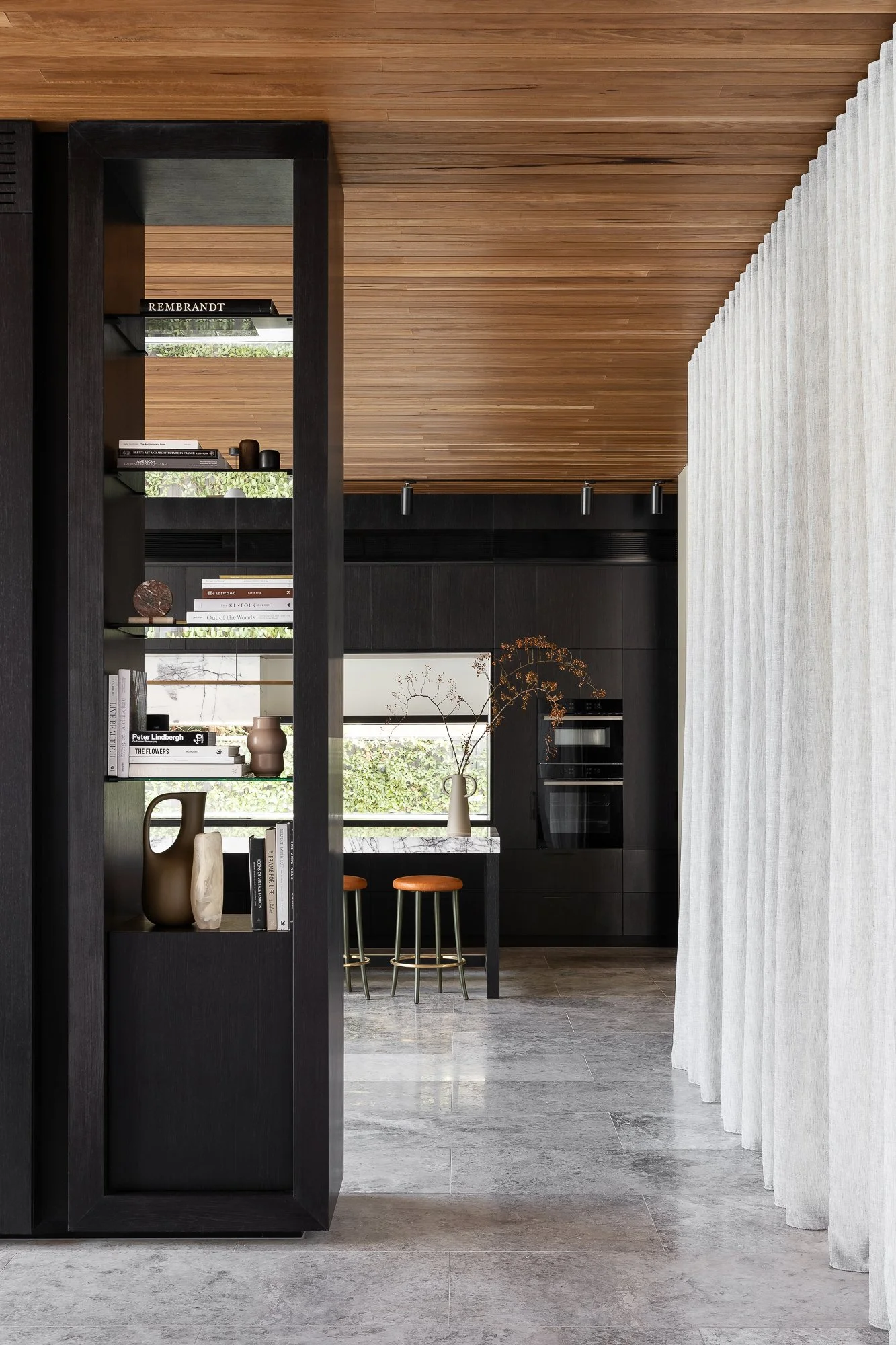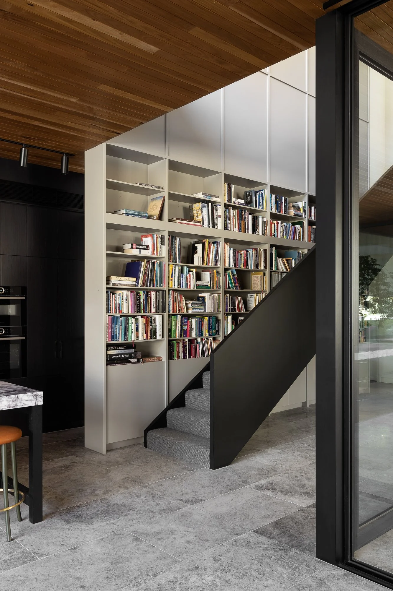 After 40 years in the same neighbourhood, the owners sought to remain close to their community while creating a home for the future. Situated on a busy corner block opposite the local park, the residence balances privacy with connection. The interior joinery showcases dark timber veneer with New York marble in the kitchen, paired with natural stone benchtops and integrated appliances. A 6 meter high, two-story bookcase beside the stairs adds visual drama and storage, while full-height mirrored face-level cabinetry in the bathroom maximises space, light, and functionality throughout the home.