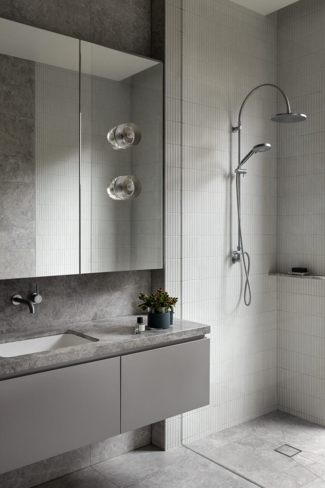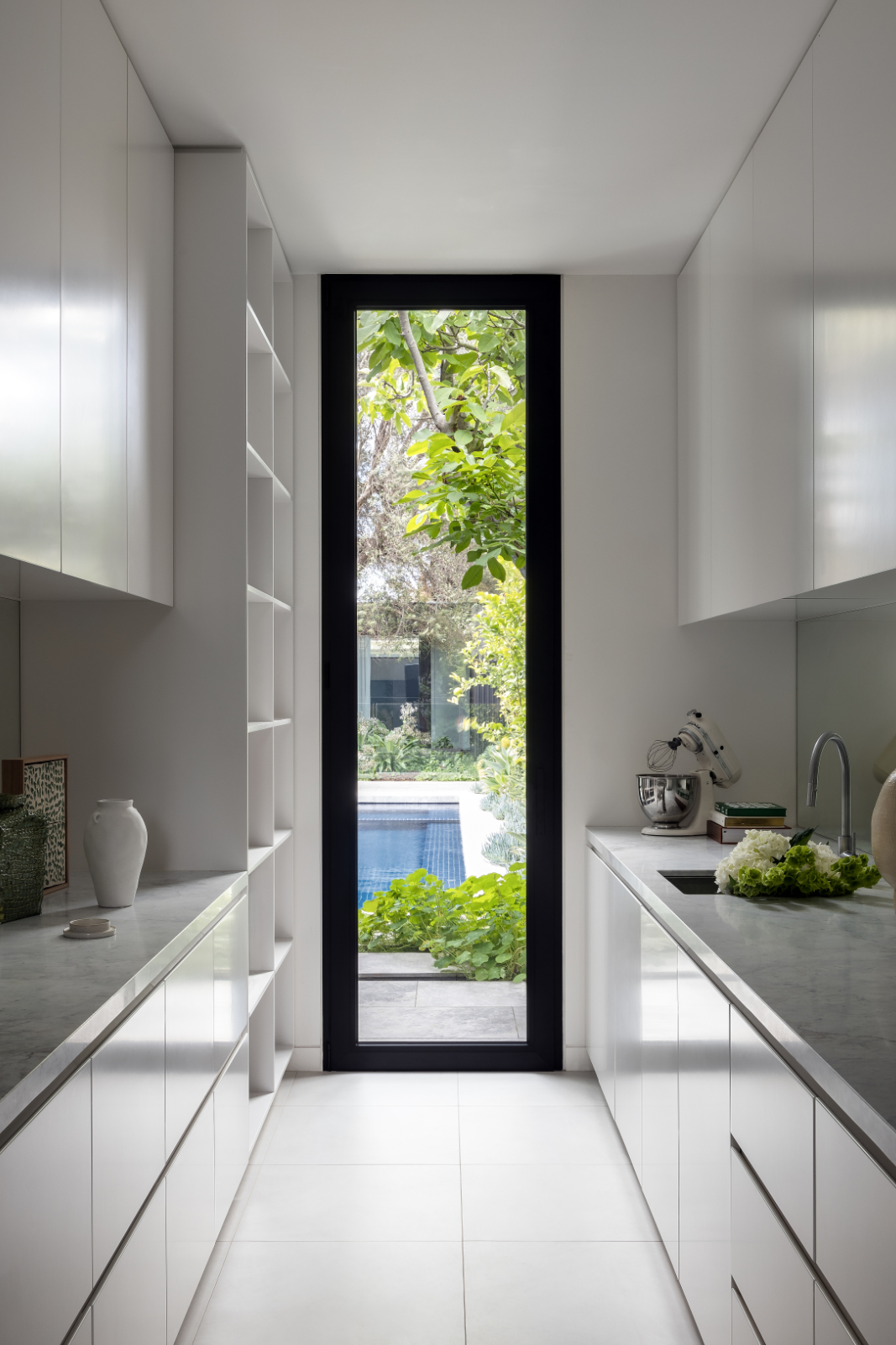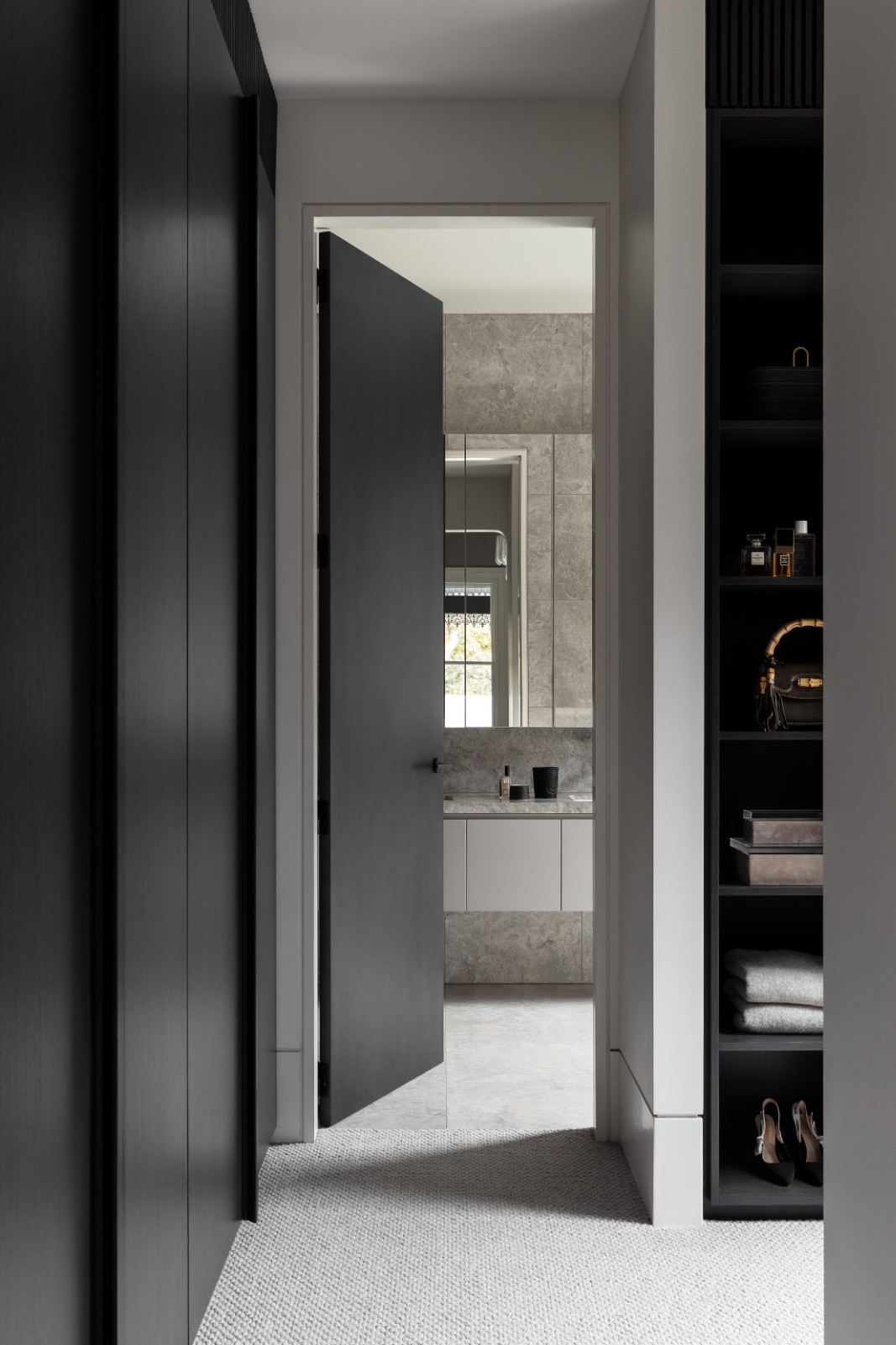 Set in Melbourne’s bayside suburb of Brighton, the South Road project reimagines a stately Victorian home through a refined contemporary lens. The owners envisioned a light-filled, practical family residence that would honour the home’s heritage while embracing modern design. A seamless new addition houses the open-plan kitchen, living, and dining areas, unified by a sleek monochromatic palette. The kitchen features a combination of 2-pack and dark timber veneer joinery, with marble benchtops continuing throughout the home. Custom timber handles, full-height storage, office joinery, walk-in robe cabinetry, and dining room wall panelling in dark veneer add texture, warmth, and cohesive detail.